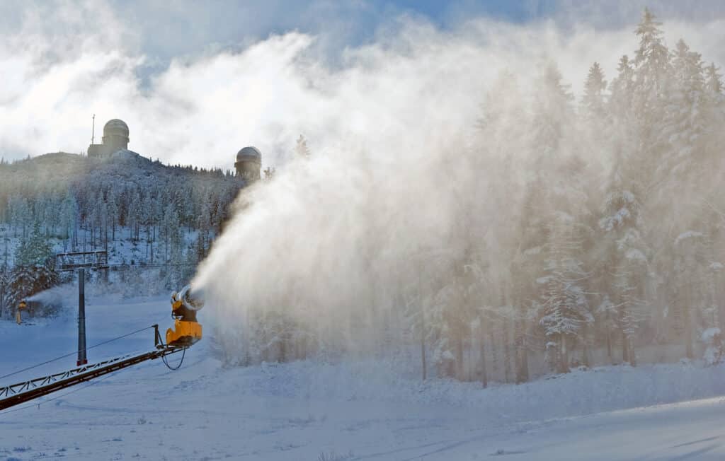 Es wird von den Techno Alpin-Maschinen zu feinsten Partikeln zerstäubt und durch die kalte Umgebungsluft am Arber in erstklassigen Schnee verwandelt.